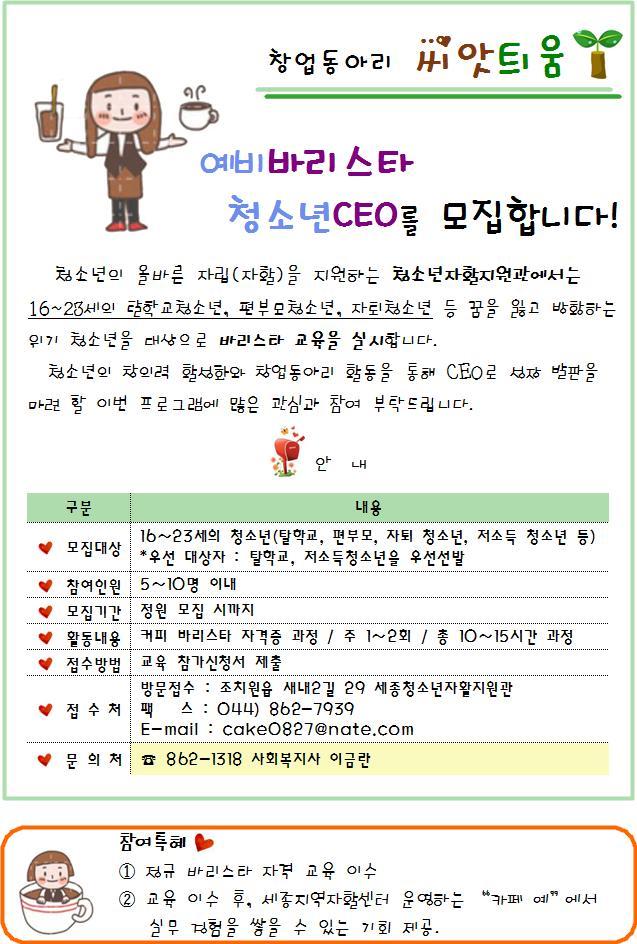 씨앗틔움 동아리회원 모집 페이지 정보 작성자 관리자 댓글 0건 조회 10,383회 작성일 13-12-18 08:52 목록 본문 이전글청소년드림스케치 "전문직업인 만남" 13.12.27 다음글세종지역자활센터 노인일자리사업 아파트택배 참여자 모집 13.12.12 댓글 0 댓글목록 등록된 댓글이 없습니다.