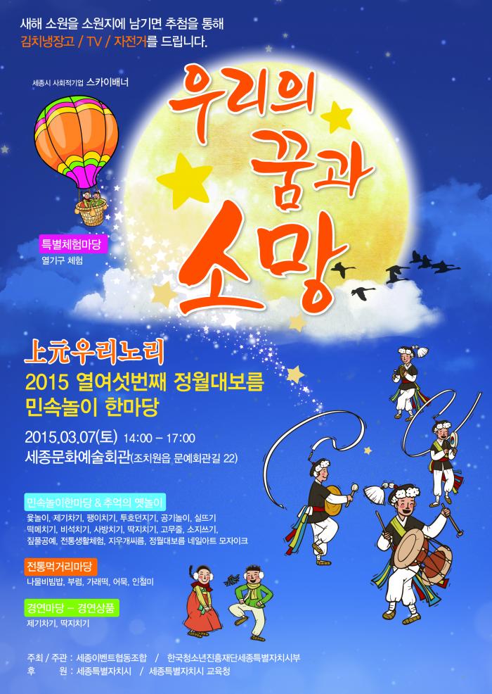 2015년 정월대보름 민속놀이 한마당 페이지 정보 작성자 관리자 댓글 0건 조회 10,384회 작성일 15-02-27 11:24 목록 본문 이전글세종지역자활센터 2014년 후원금품 수입 및 사용결과 공고 17.02.28 다음글2015 청소년어울림마당 "기획단 청소년 모집" 15.02.02 댓글 0 댓글목록 등록된 댓글이 없습니다.